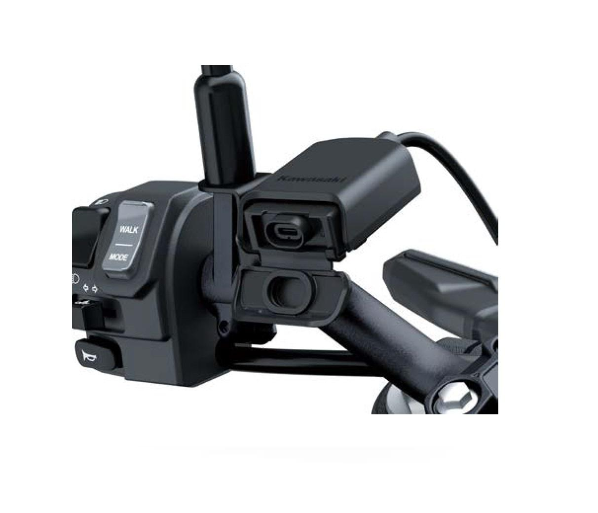Vodotesná zásuvka USB-C pohodlne umiestnená na riadidlách. Tlmená vibráciami a zásuvka môže byť uzatvorená viečkom. Celkový maximálny výstup je 3 A. (Na prevádzku je potrebné nainštalovať súpravu relé) (k dispozícii samostatne)